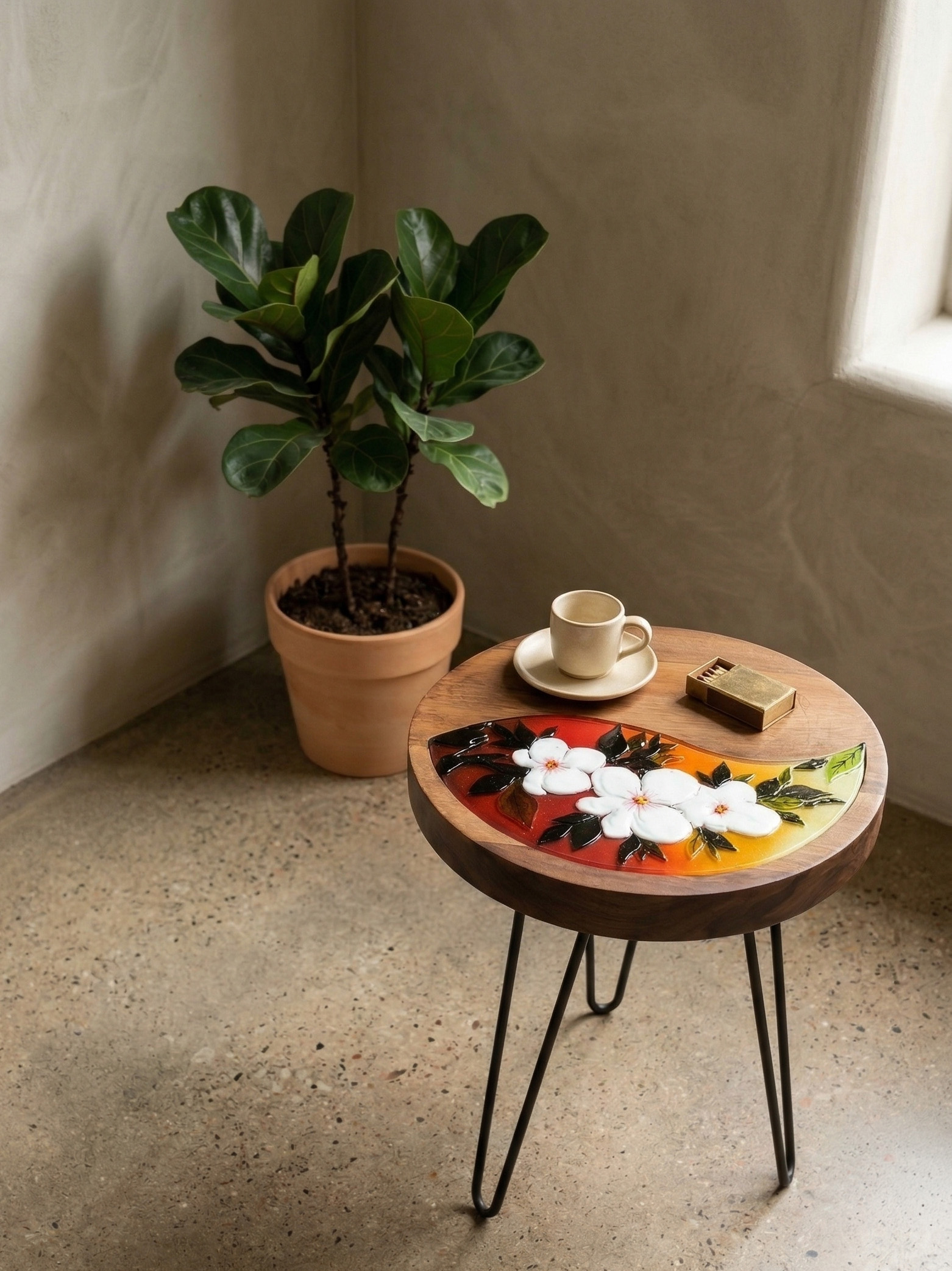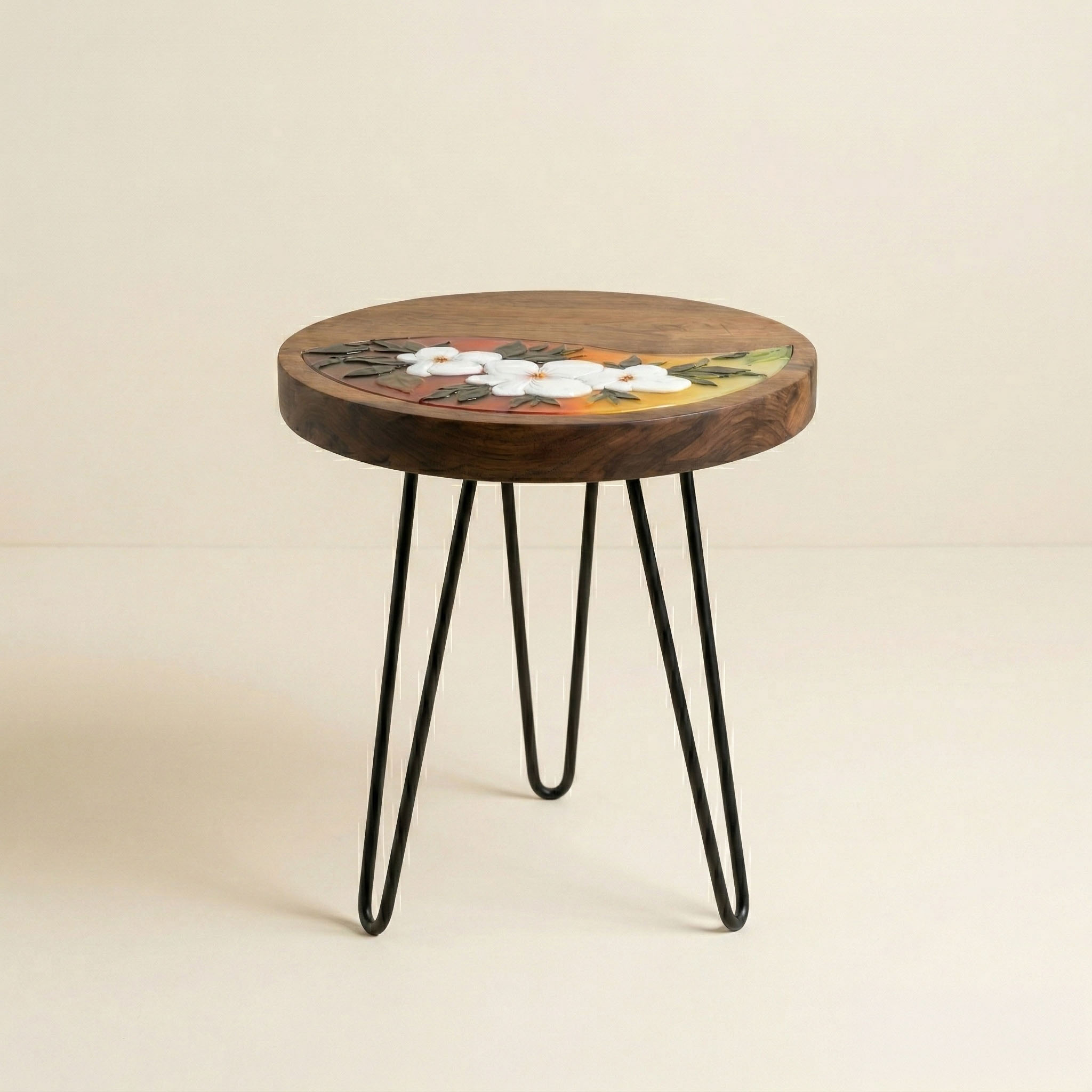 Tamamen el işçiliğiyle hazırlanan masif ahşap üst tabla, modern ve endüstriyel bir dokunuş olan siyah metal (hairpin) ayaklarla destekleniyor. 40×40 cm çapındaki ideal ölçüleriyle salonunuzda kahvenizi yudumlarken size eşlik edecek şık bir yan sehpa veya okuma köşenizi aydınlatacak sanatsal bir odak noktasıdır. Evinde doğanın renklerini ve el emeği füzyon cam sanatının eşsizliğini hissetmek isteyenler için harika bir koleksiyon parçasıdır.