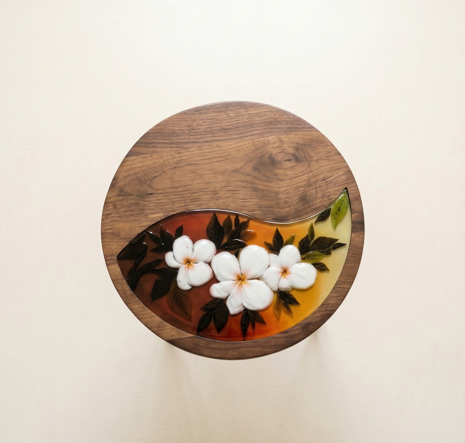 Doğal ahşabın sıcaklığını ve füzyon cam sanatının büyüleyici renklerini bir araya getiren bu özel yan sehpa, yaşam alanlarınıza egzotik bir taze nefes getiriyor. Ahşabın yapısına uygun olarak tasarlanan kıvrımlı füzyon cam bölme; kırmızı, turuncu ve sarı tonlarının kusursuz gün batımı geçişini sergilerken, yüksek ısıda fırınlanarak şekillendirilmiş üç boyutlu beyaz çiçekler tasarıma eşsiz bir zarafet ve ferahlık katıyor.