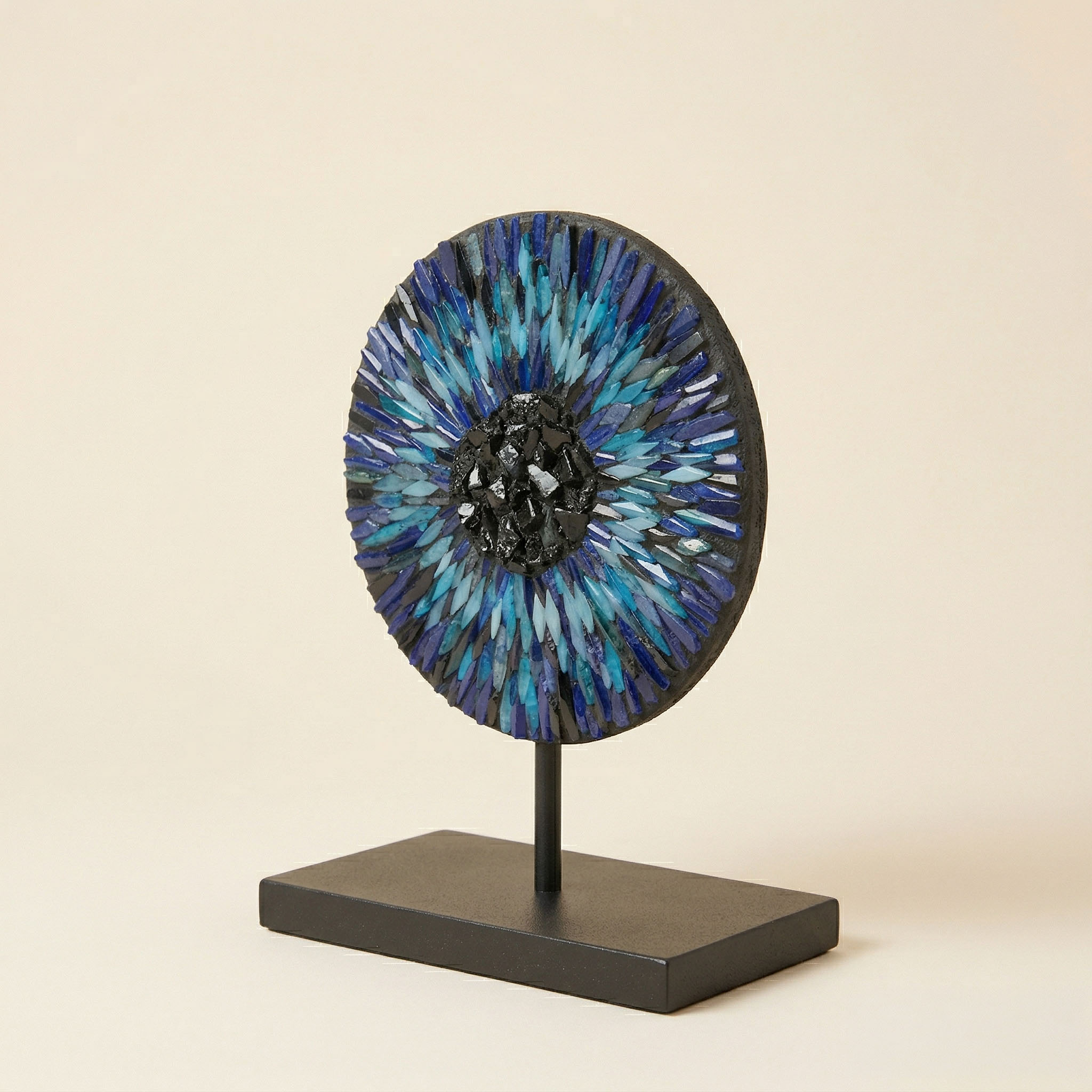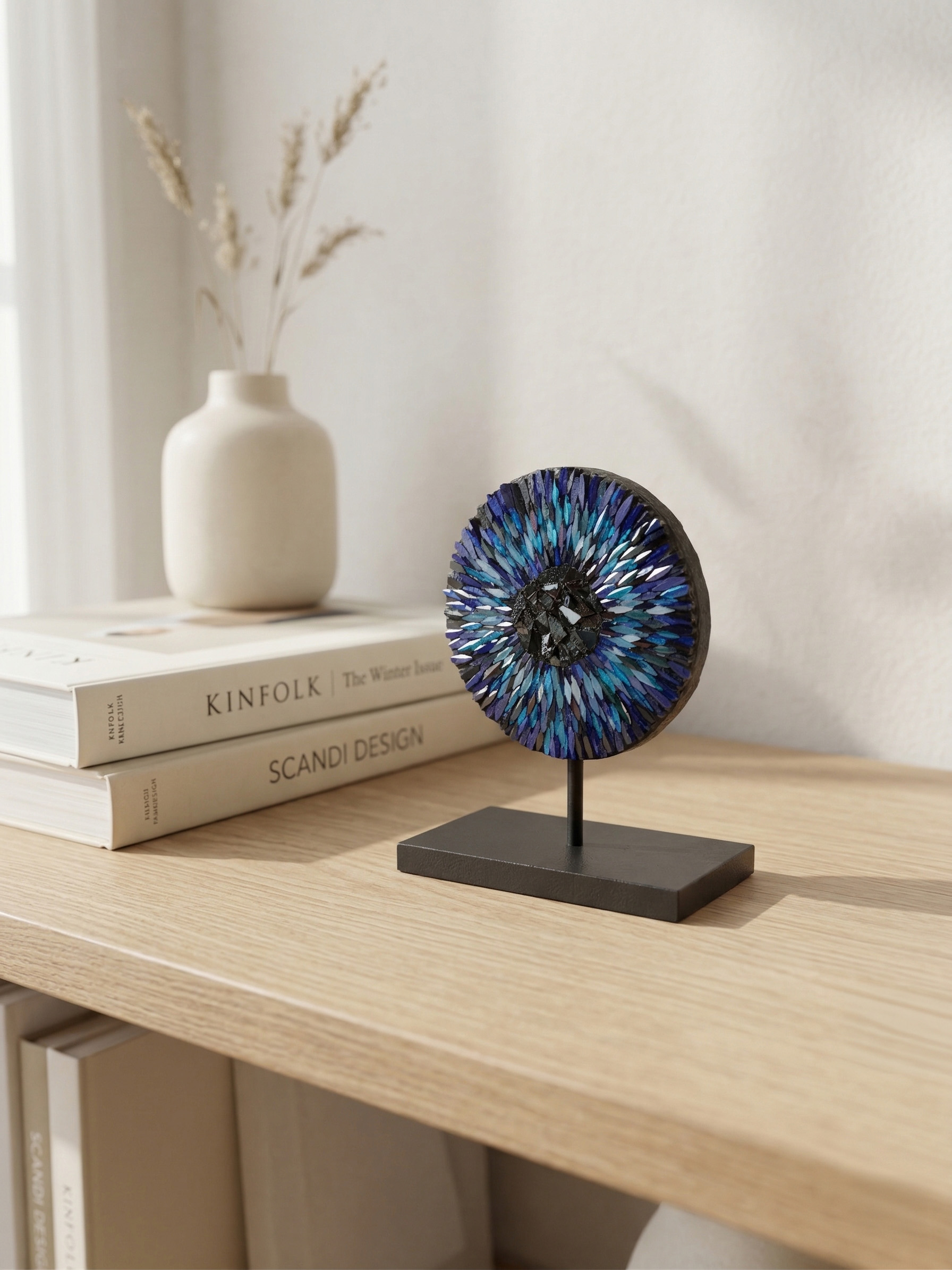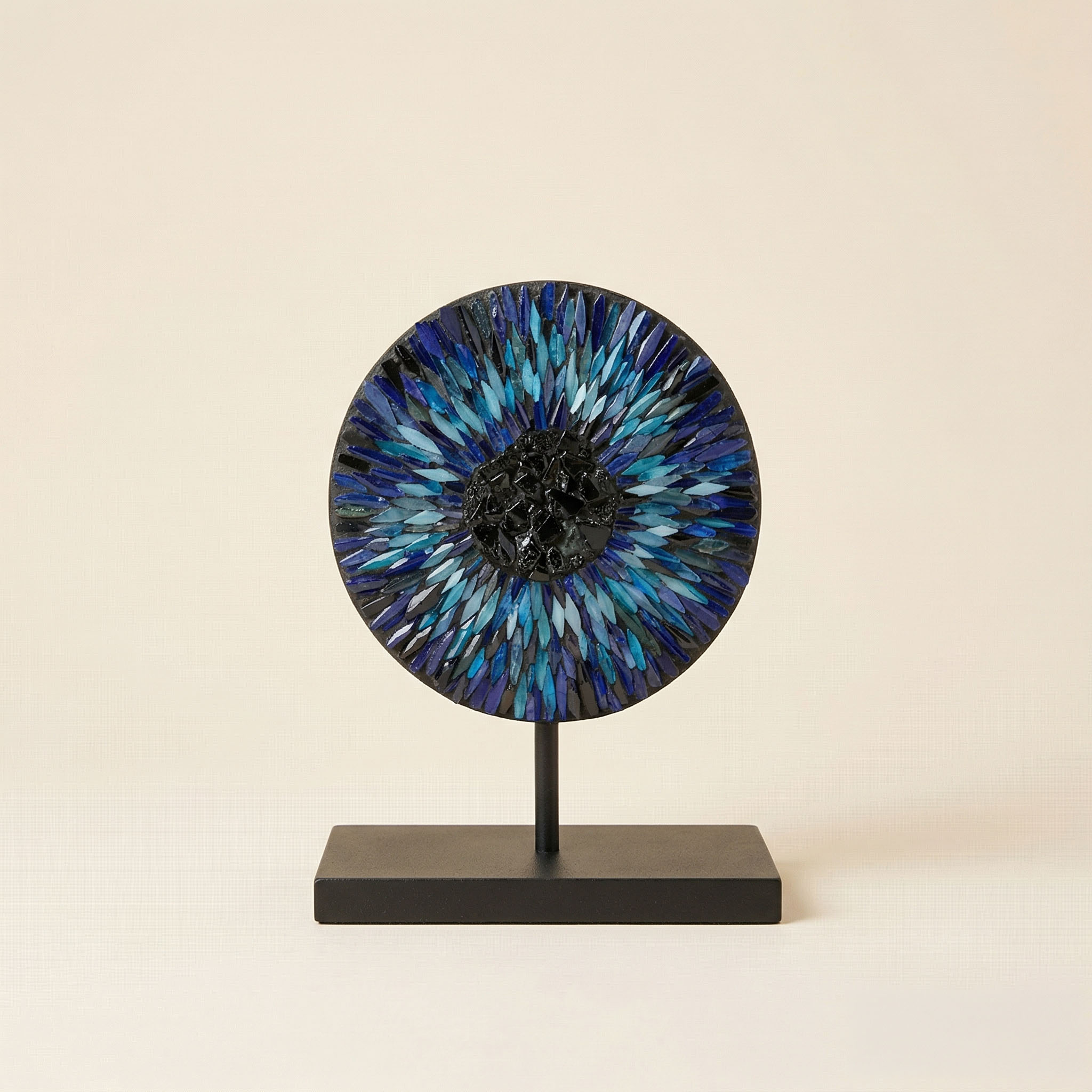 Füzyon cam tekniğiyle, her bir parçası elde kesilip özenle dizilen bu eşsiz doku, zarif mat siyah metal standı üzerinde dengeli ve şık bir duruş sergiliyor. 9 cm çapındaki bu mini şaheser; çalışma masanızda, kitaplığınızda veya dar nişlerde sergilemek için kusursuz bir sanat eseridir. Minimalist çizgileri sevenler ve derin anlamlar taşıyan “premium” bir hediye arayanlar için idealdir.