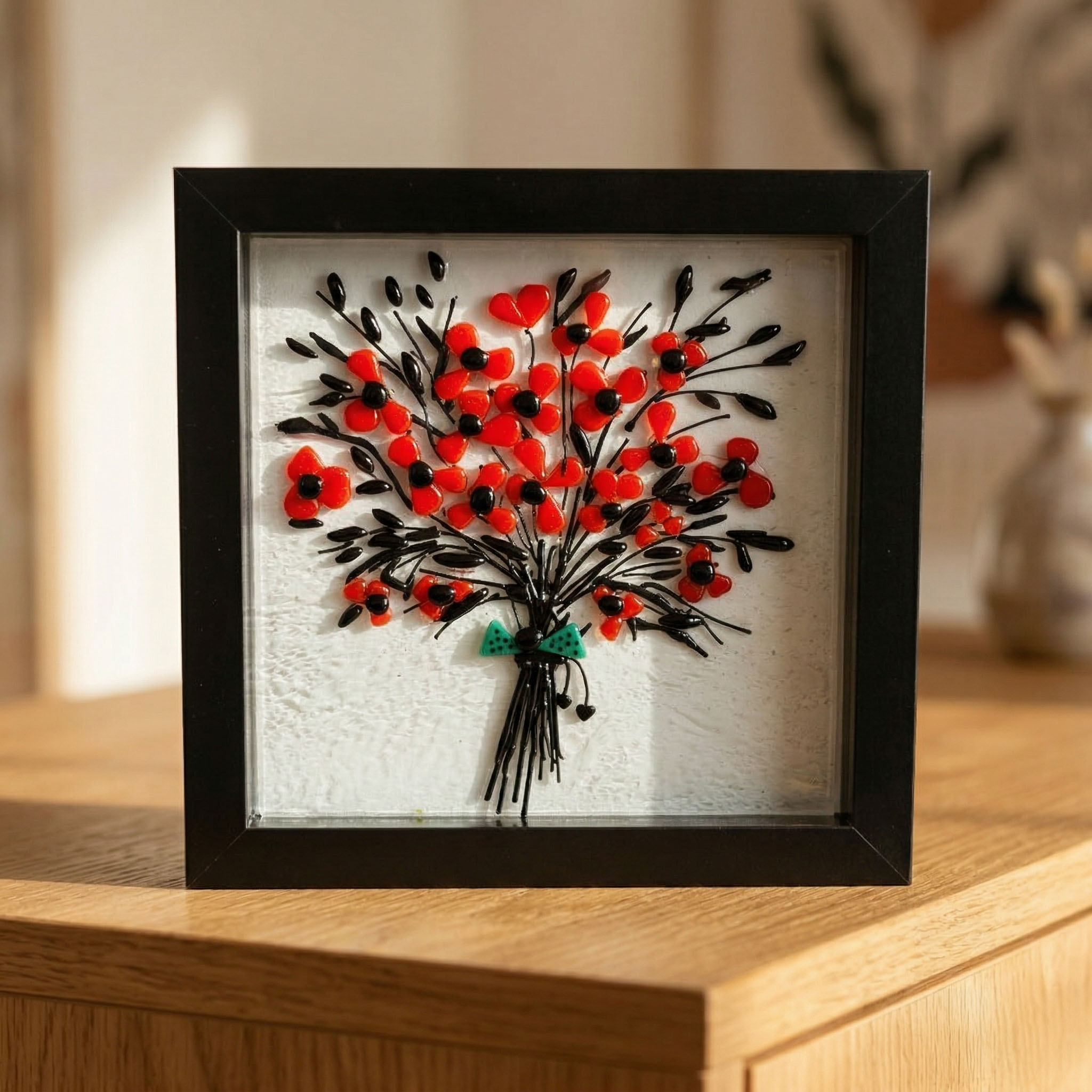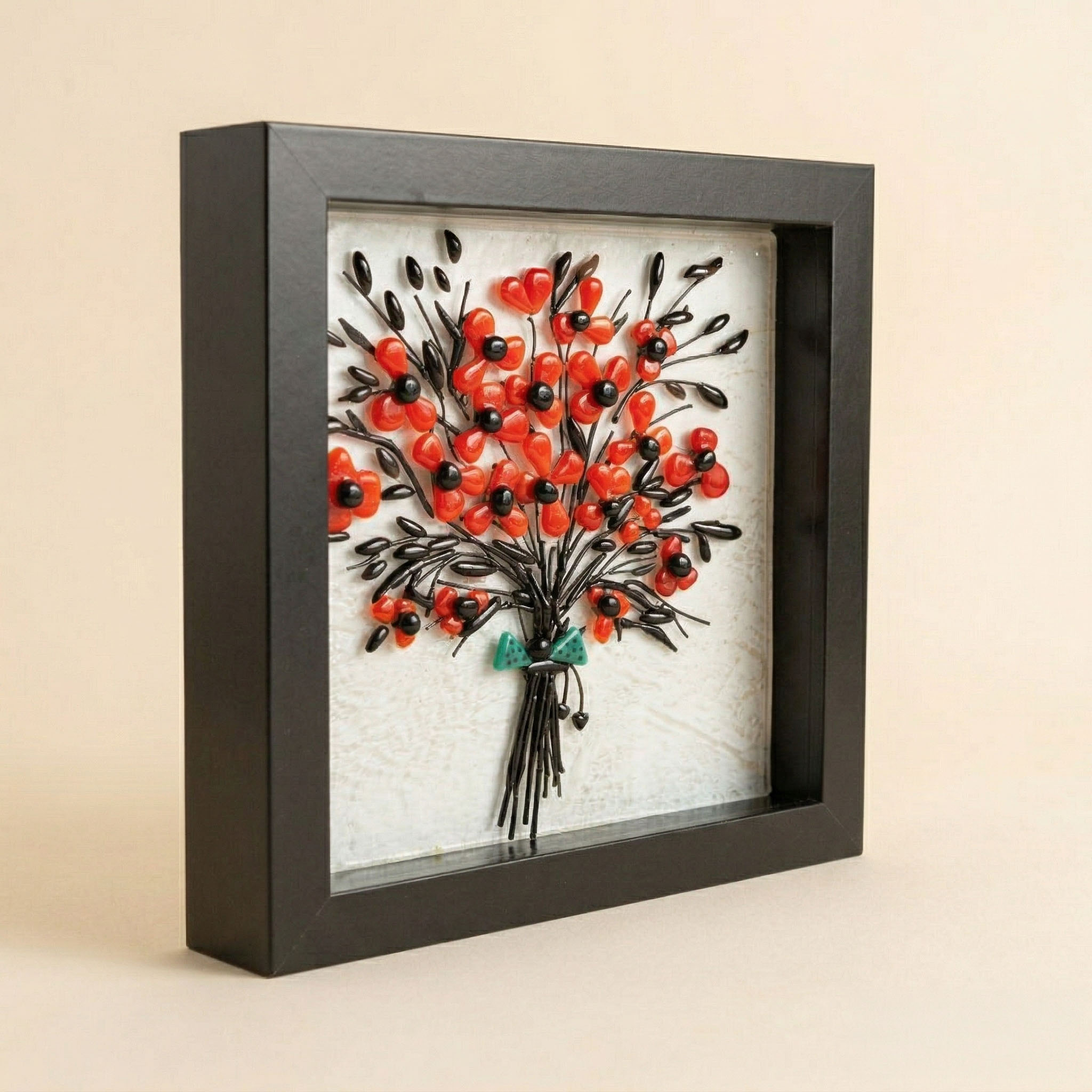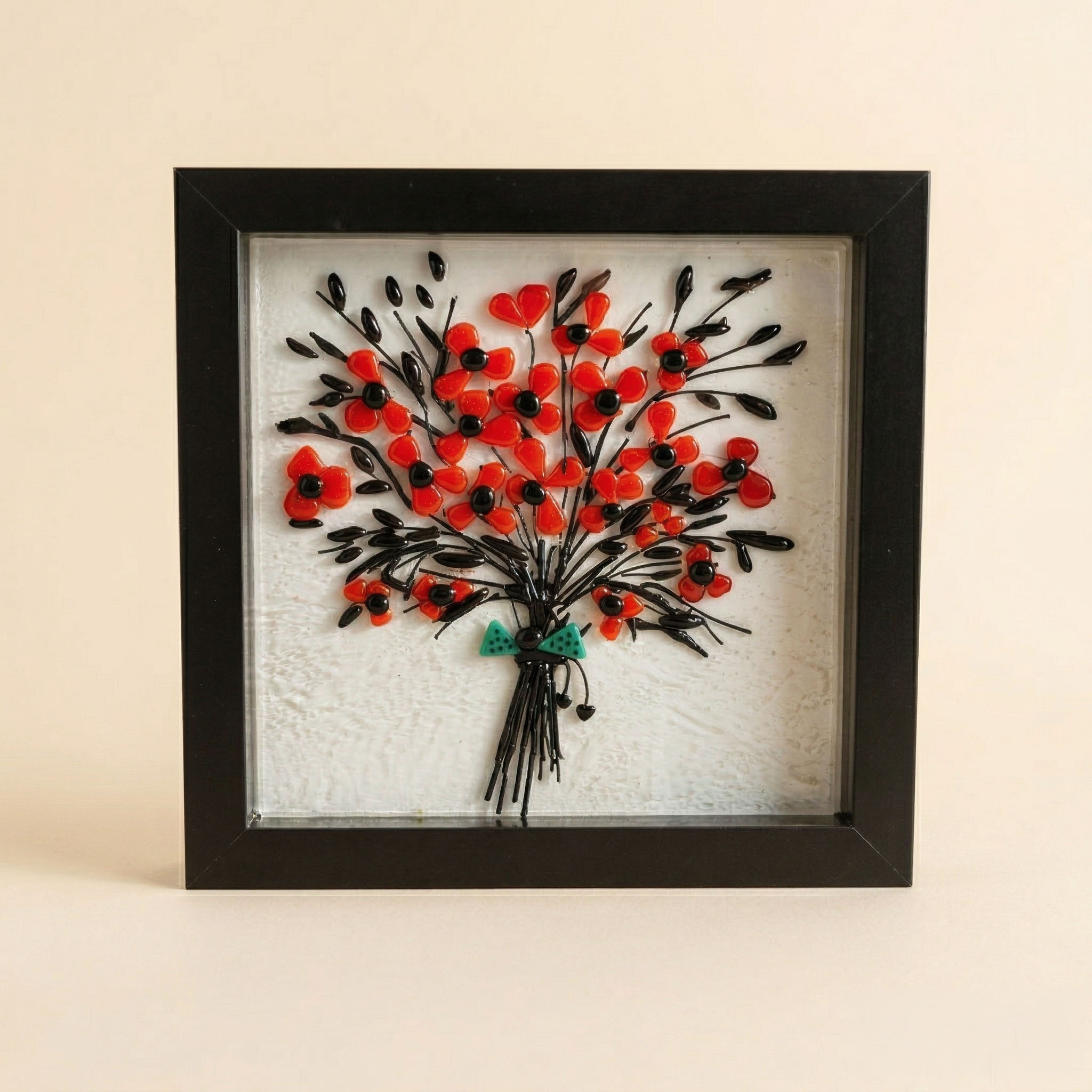 Sevginin ve zarafetin sembolü olan gelincikler, füzyon cam sanatının kalıcı ışıltısıyla bu eşsiz panoda ölümsüzleşiyor. Dokulu ve ferah beyaz zemin üzerinde yükselen siyah dallar, canlı kırmızı cam yapraklar ve siyah merkezleriyle büyüleyici bir çiçek buketi oluşturuyor. Buketin gövdesinde yer alan minik yeşil kurdele detayı, tasarıma romantik ve sıcacık bir dokunuş katıyor.