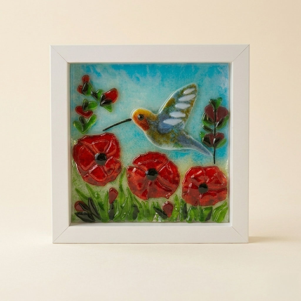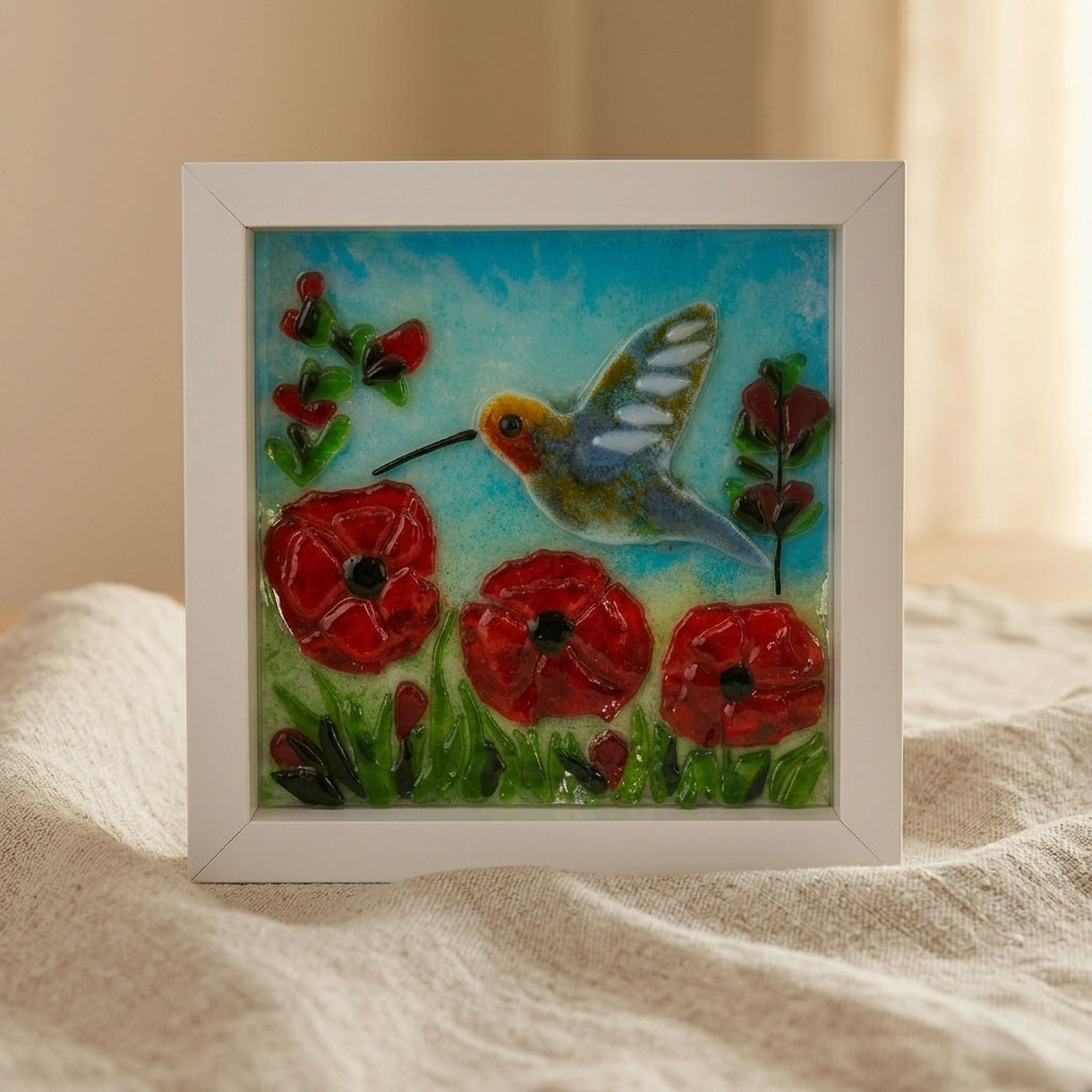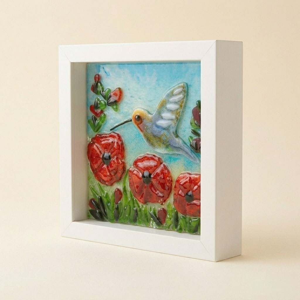 Doğanın en zarif ve hareketli canlılarından biri olan sinek kuşunun (hummingbird) o büyüleyici dansı, füzyon cam sanatının canlı renkleriyle duvarlarınıza taşınıyor. Ferah mavi gökyüzü dokusunun önünde süzülen sinek kuşu figürü, üç boyutlu ve parlak kırmızı gelinciklerle buluşarak evinize adeta bir ilkbahar sabahının taze enerjisini getiriyor.
